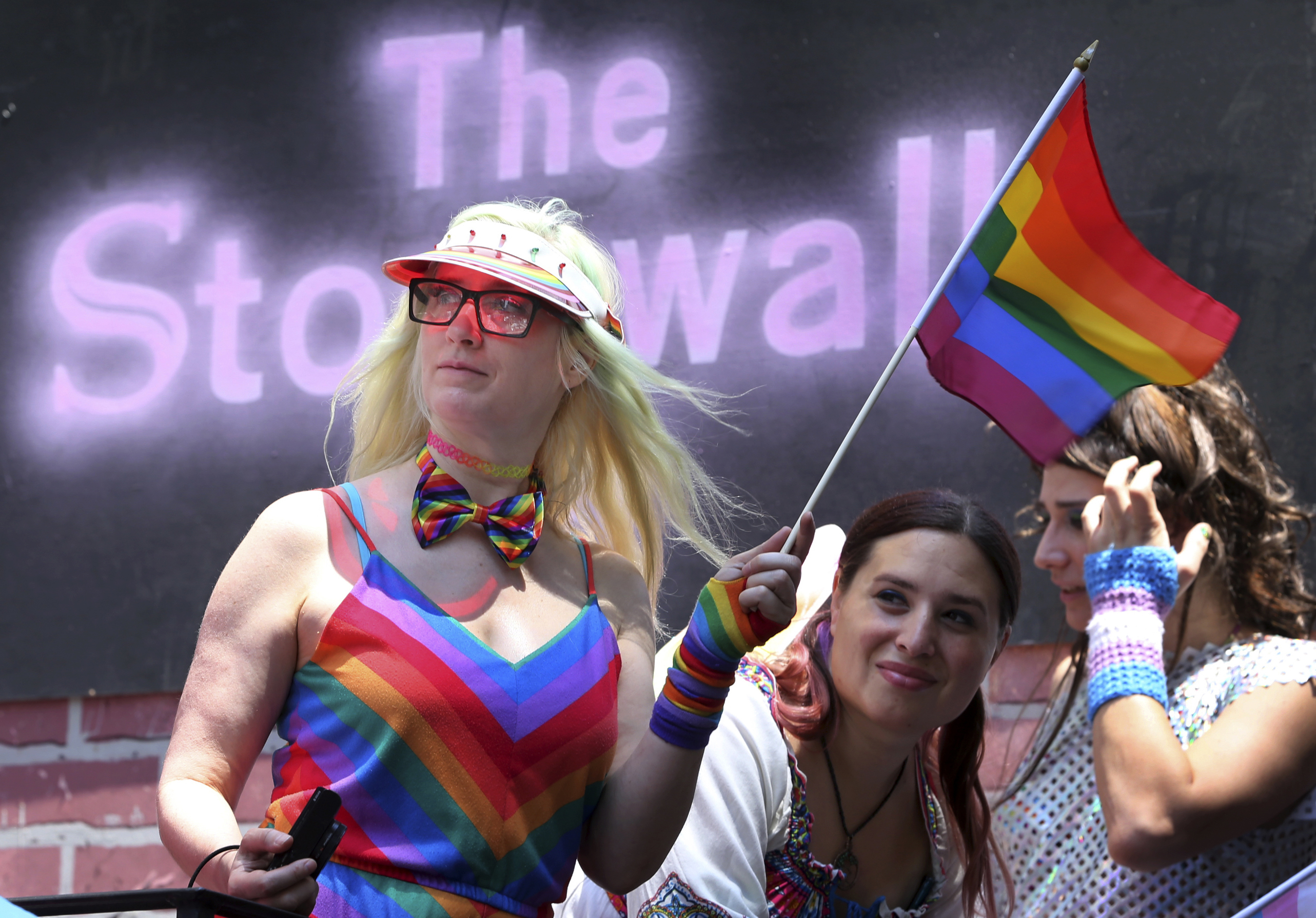 Participants of the gay pride parade stand in front of the Stonewall Inn